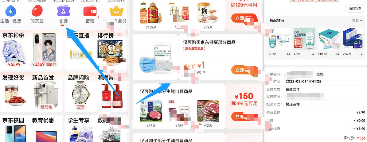 1、京东APP首页“领券”->下拉领取9.9减8.9元券->把口罩加入购物车