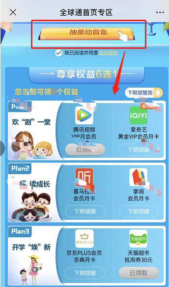限移动全球通银卡、金卡、白金卡以及以上的用户参与,能领的会直接显示在图中位置,先领天猫,领第二次需要邀请一个人