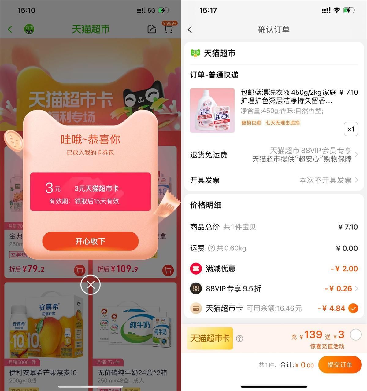 淘宝APP扫码->领取3元猫超卡->找到猫超包邮商品,抵扣猫超卡后最低0元到手