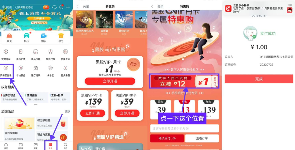 每月一次周五十点工行网易云月卡1元购,需数字人民币支付