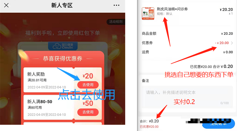 活动期间参与智云健康新人福利0.2元购的活动,点击立即领取,可以领到一张满20.1减20元优惠券,然后点击页面最下面的打开智云健康APP,新人福利0.2元购,里面有很多商品,洗衣液,洗洁精,牙膏等