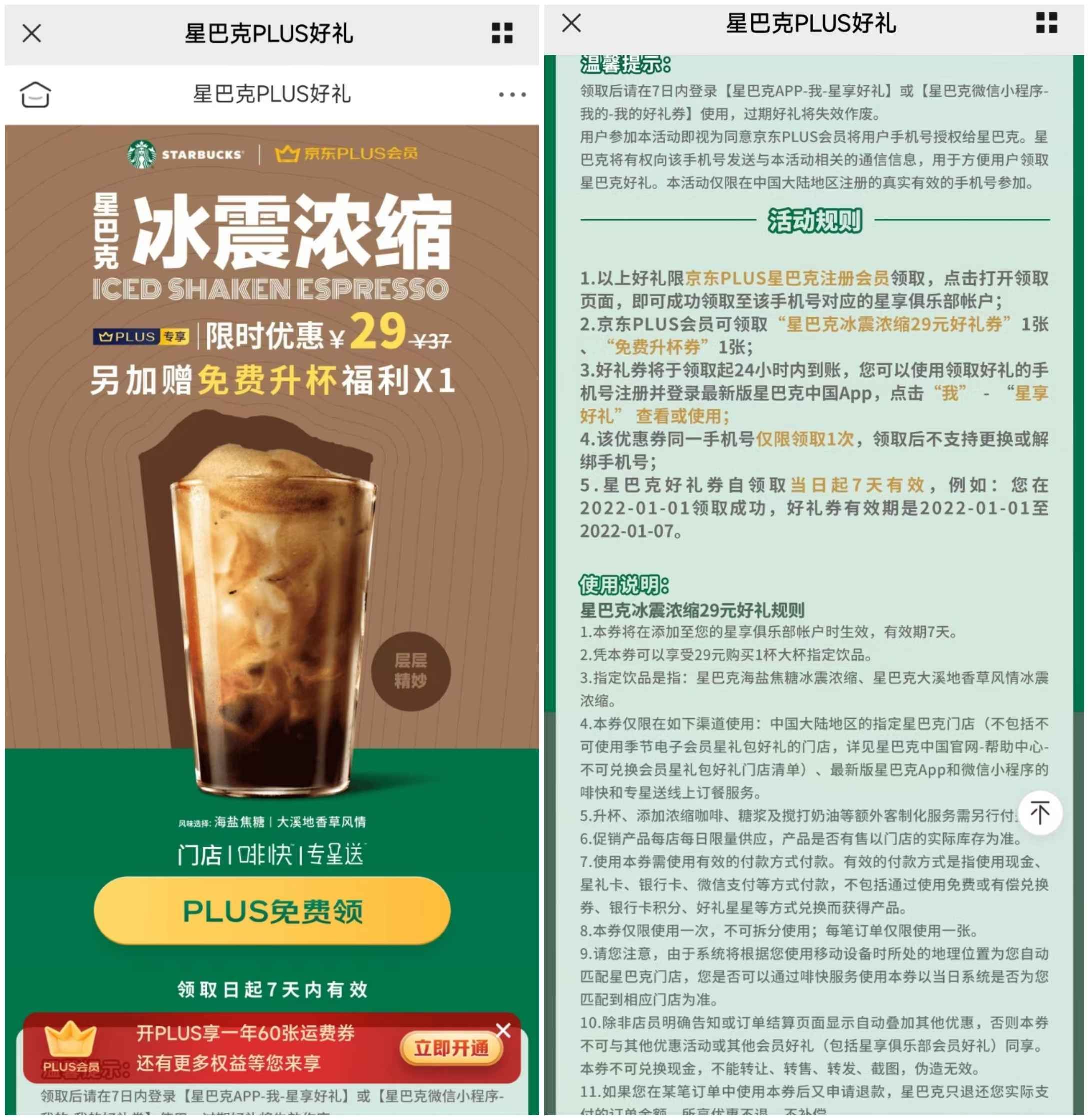 本文仅限京东PLUS会员参与,可以领取1张星巴克冰震浓缩29元好礼券