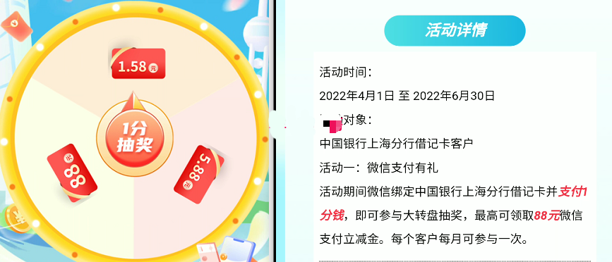 活动期间微信绑定中国银行上海分行借记卡并支付1分钱,即可参与大转盘抽奖,最高可领取88元微信支付立减金。每个客户每月可参与一次。