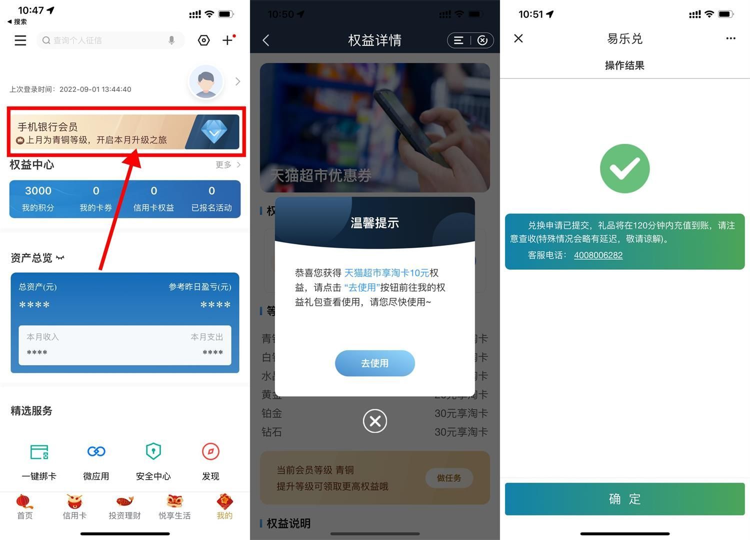 2、全部任务完成->升级到青铜会员->领取10元猫超卡->根据页面提示兑换