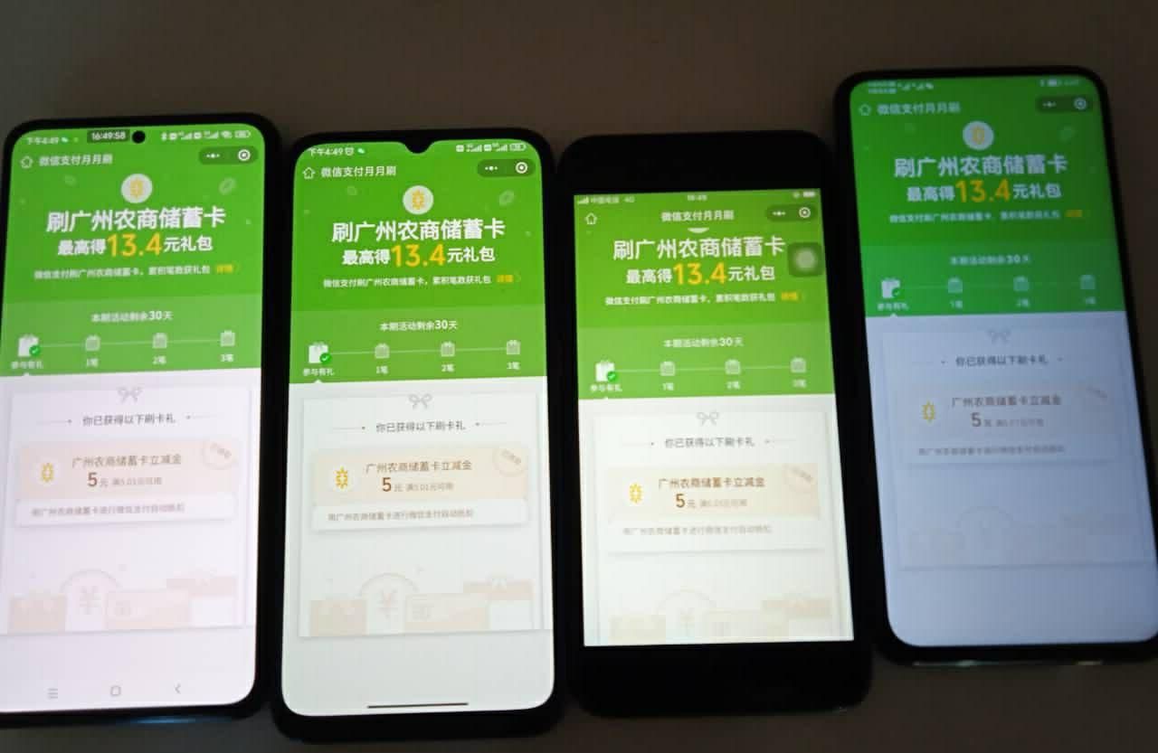 广东农商(珠江直销)借记卡用户绑定微信识别扫描下面月月刷活动小程序参与广东农商(珠江直销)月月刷活动最高领取13.4元微信立减金。报名成功立即获得5元微信立减金,每日消费使用微信选择广东农商卡支付累计满1笔2笔3笔且单笔支付金额满5元可分别再获得1.8元、2.8元、3.8元的微信立减金奖励。单号累计可获得最高13.4元的微信立减金。多号参与需要多台设备同时点击参与活动(见图二)。