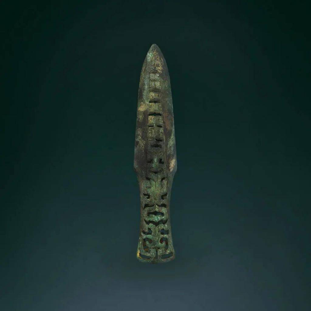 古代军事活动是现代体育运动的起源之一。中国传统体育的培养和发展与军事活动密切相关。兵器的历史和艺术价值可以在一定程度上反映中国武术的文化缩影。自古以来,中国武术文化特色就留下了崇尚和平、以和平为重的历史故事,如为武而战、为犁铸剑。这既是中国武术的文化精神,也是中华民族传统文化内涵的体现。此青铜头雕有鸟纹矛头。通体镂空对称鸟形花纹。做工精致,造型十分精美。具有非常明显的巴蜀地区特色。