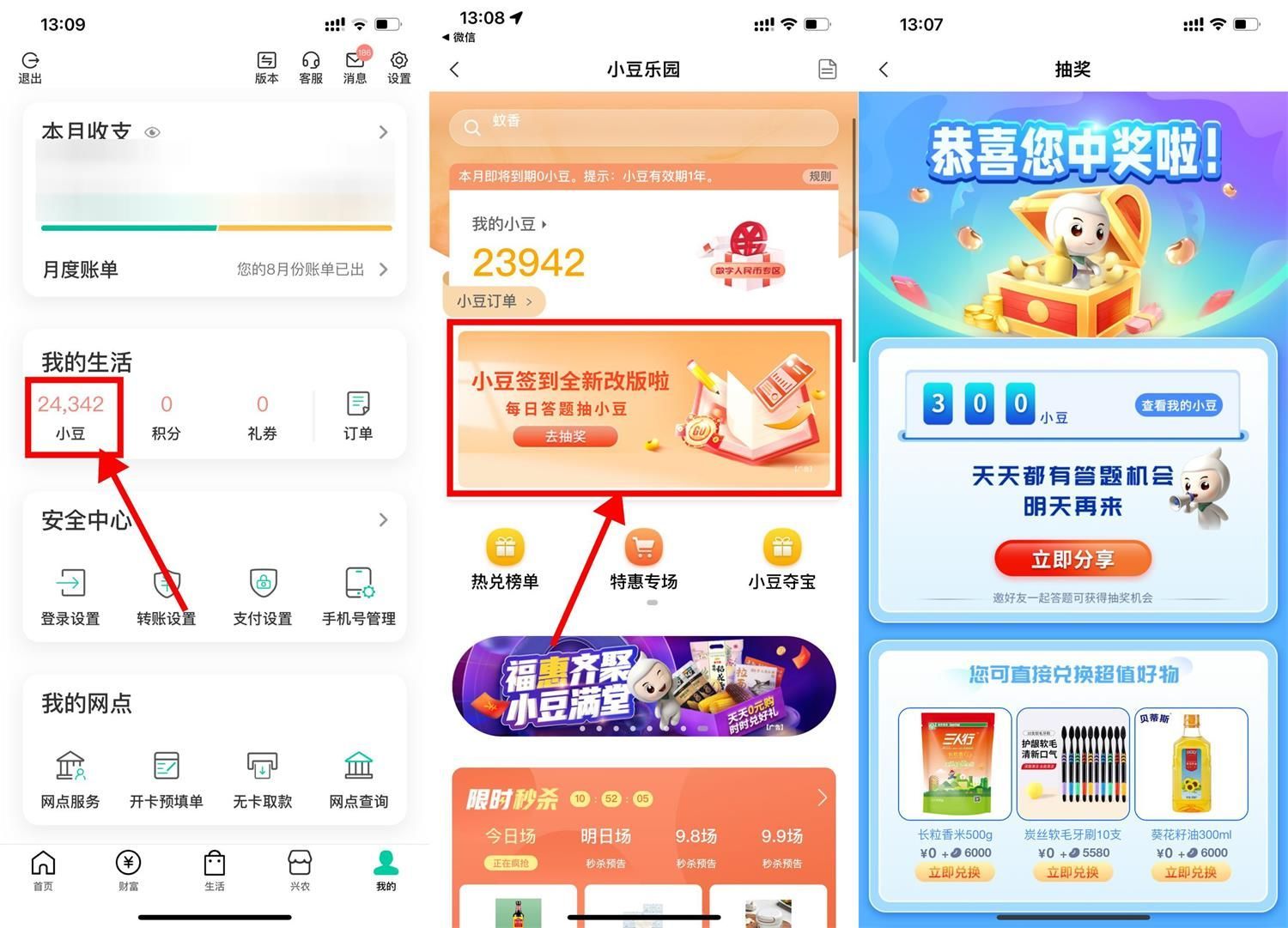 农行APP->我的->小豆乐园->点击横幅进入->简单答对2题抽小豆->累计小豆可兑换实物包邮