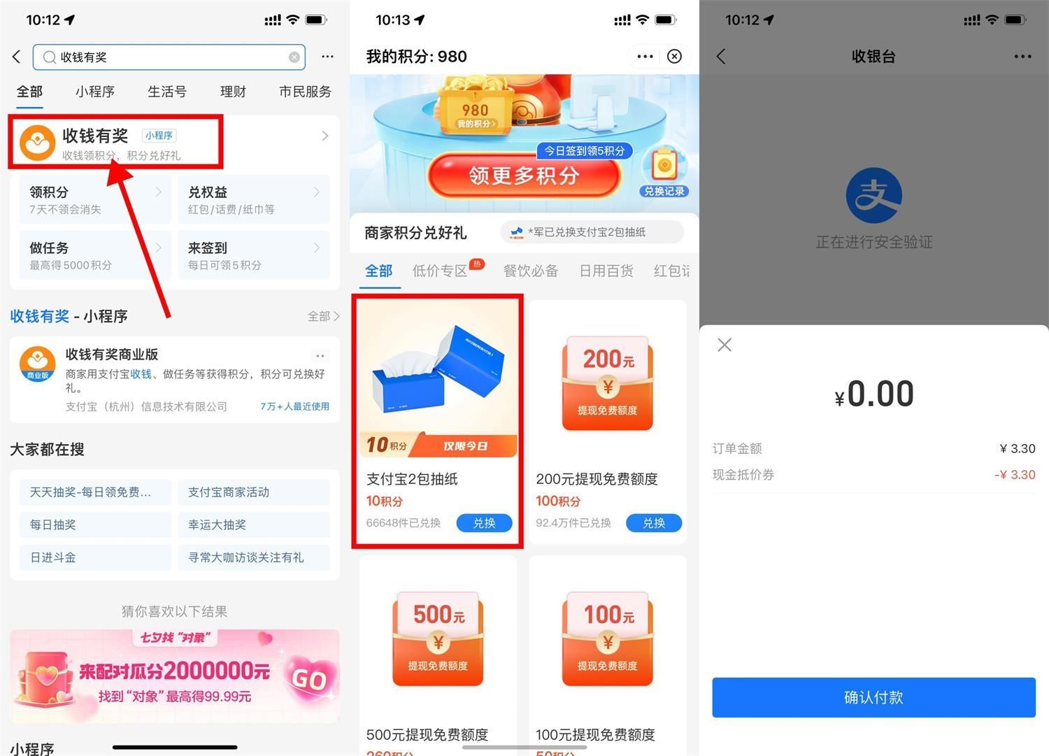 支付宝搜索“收钱有奖”进入->下拉找到“支付宝招财纸巾2包 1积分”->用1积分兑换0元下单即可!