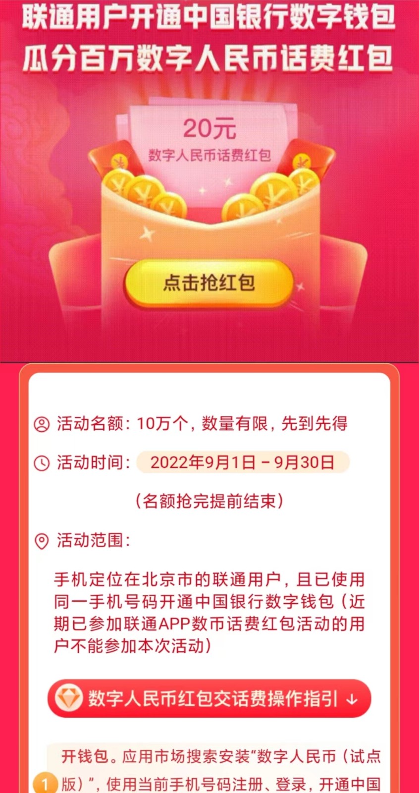 下载中国联通app,用联通号码登陆,然后联通app扫码领取20元数字红包,需要定位北京。