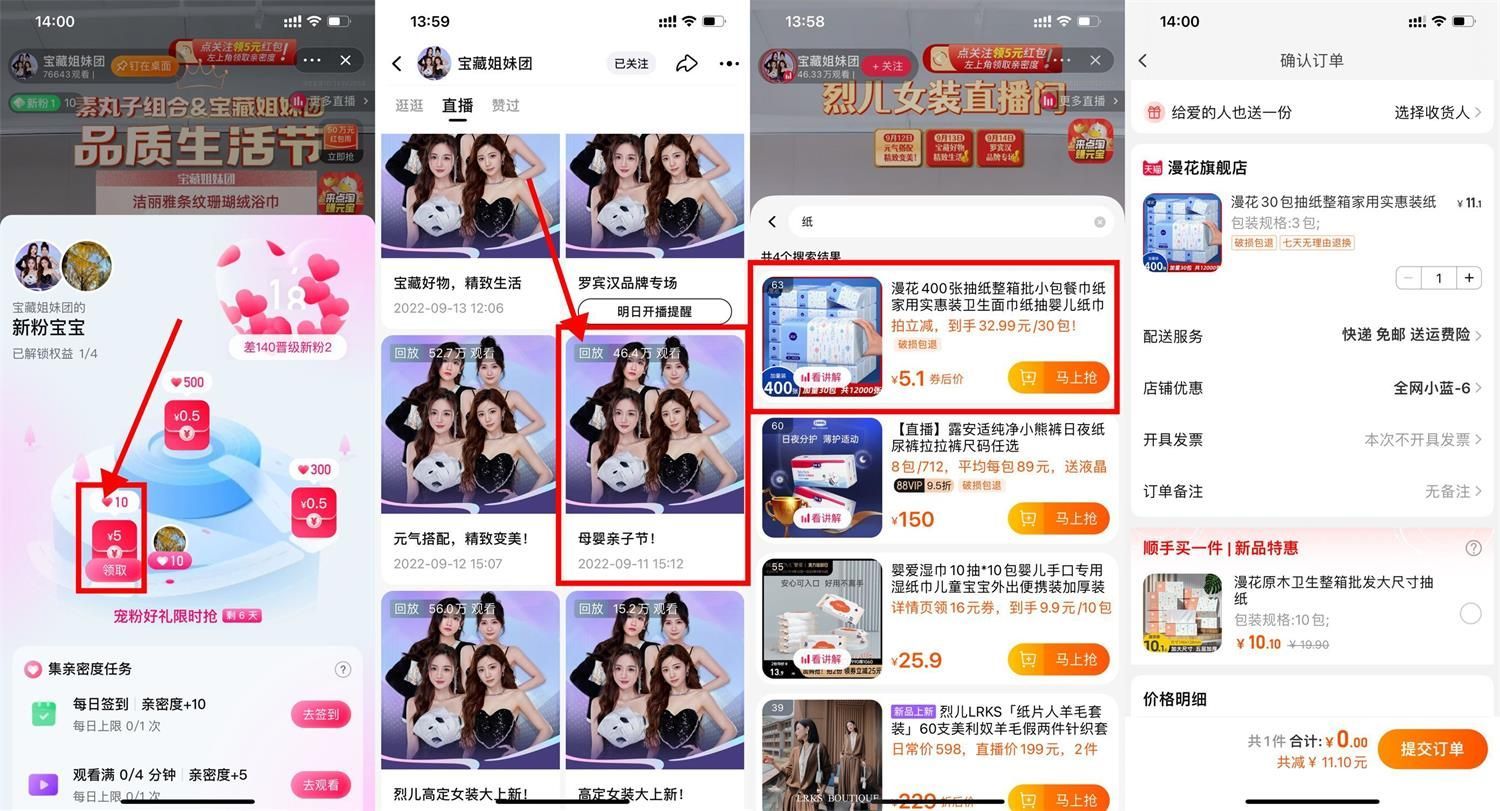 淘宝APP扫码->左上角关注10亲密度领5元红包->然后点击左上角头像->找到11号的直播进入->左下角商品袋搜索“纸”->抵扣红包后0.1元包邮到手