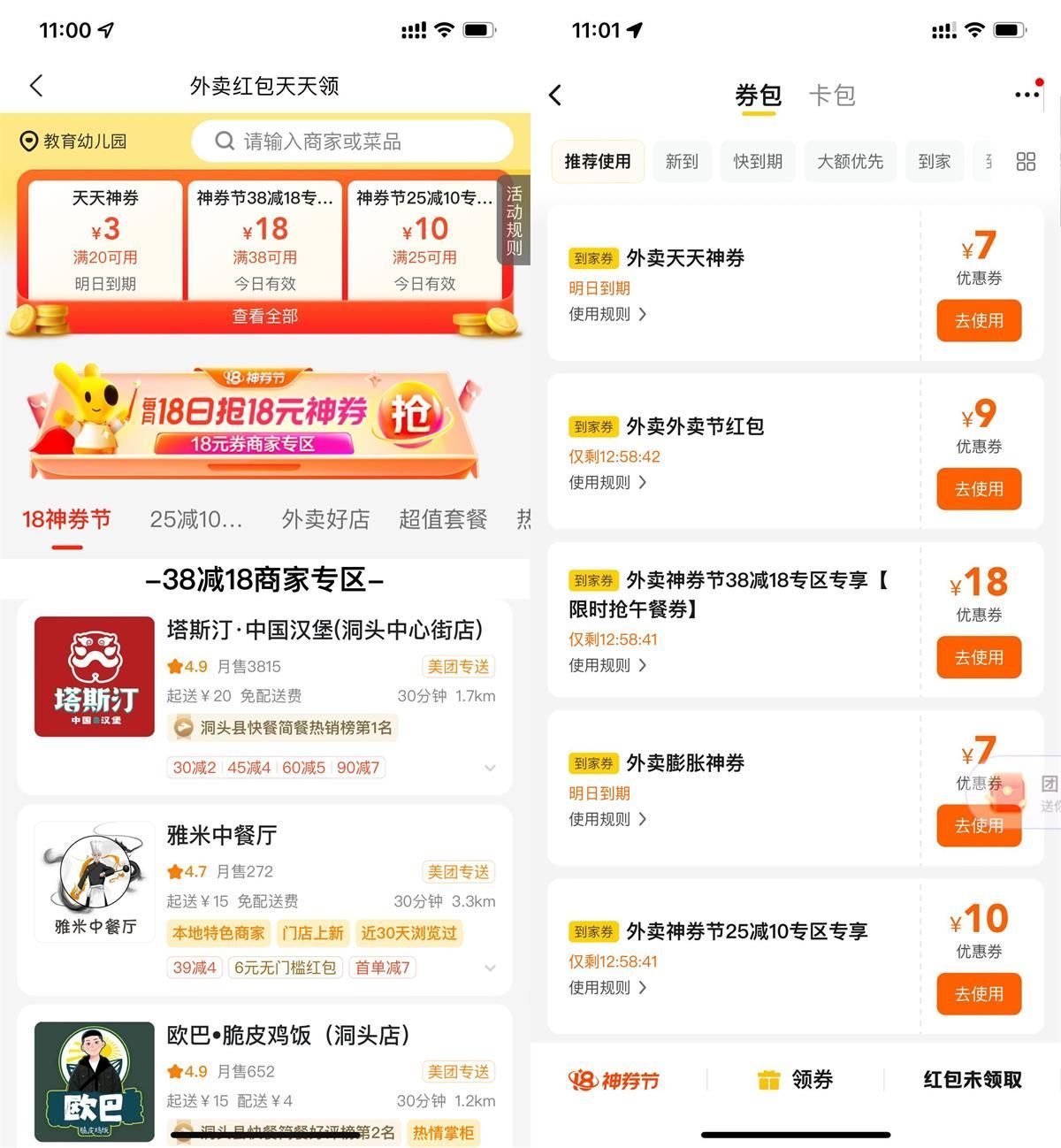 美团扫码->直接领取->今天11、14、17、21点可各领取一张38减18元券->神券只限今天使用->今天刚好要点外卖的可以领一下