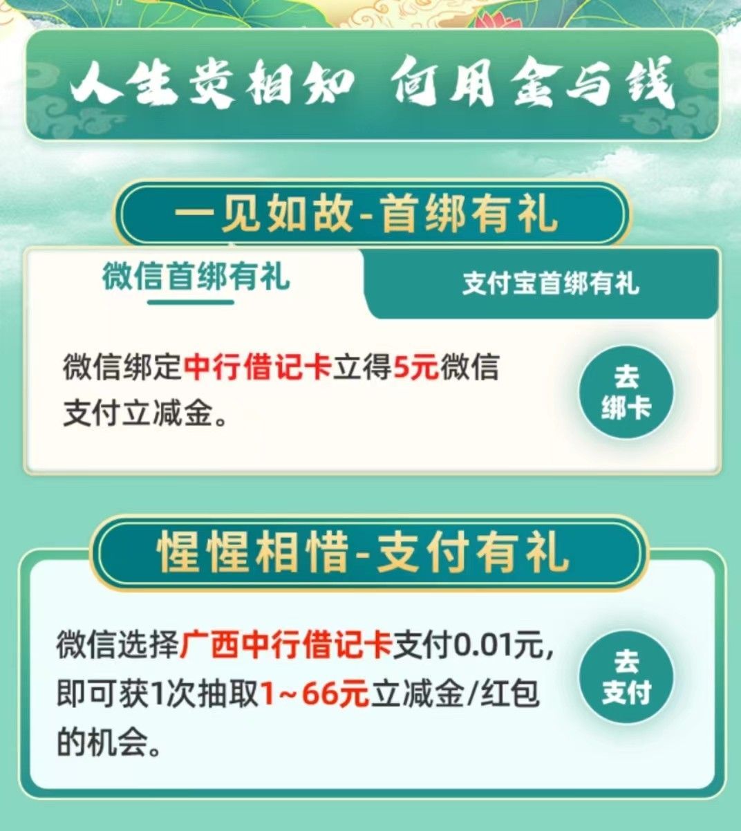 限持有广西中行卡的客户,人人有礼!本月关注“中国银行广西分行”公众号回复“推荐”参与快捷支付三重礼,最高享66元立减金。