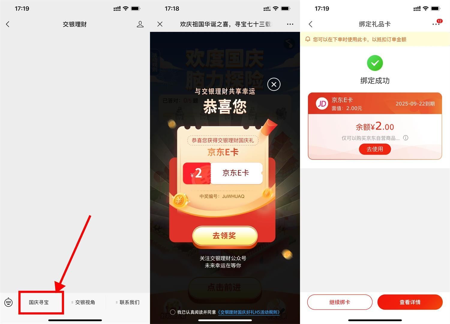 微信关注公众号“交银理财”->菜单栏“国庆寻宝”->答对5题抽2元京东E卡