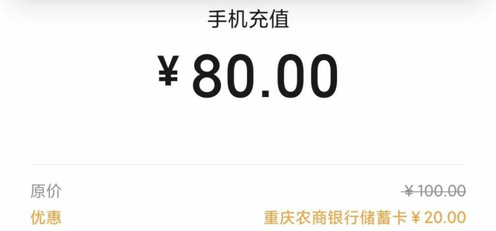 重庆农村商业银行借记卡(含直销银行电子卡)用户,每月可享受微信充话费满100减20或满50减15优惠一次,单用户单月可参与一次。另外微信服务生活充值Q币满15减7优惠,每月三次。活动每日凌晨更新名额,两个活动给别人代充有30毛左右的利润。