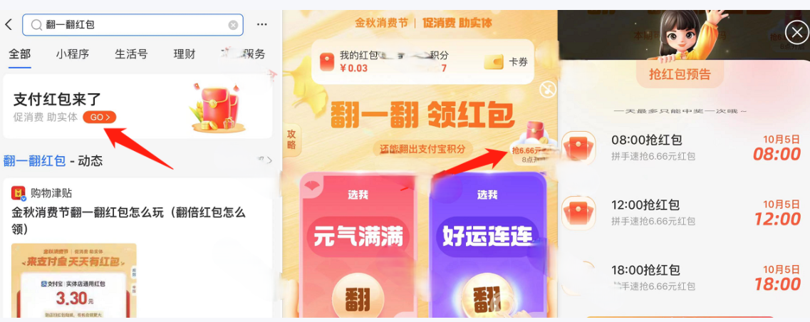支付宝搜索翻一翻红包,右上角抢6.6红包,共分三个时间点,需要的留意