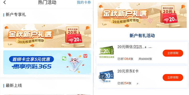 北京银行新用户开通2类户领取20E卡或立减金