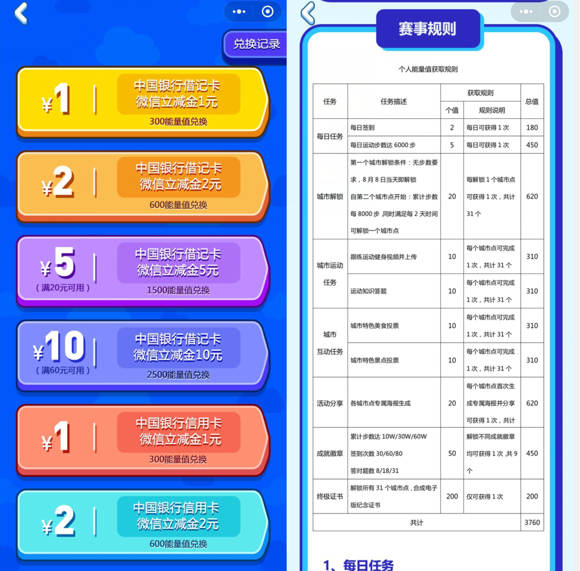 微信进入小程序“健步云游”->乱选个城市报名->每个城市点进去完成运动、分享、互动等任务,一共可得3140能量,指定能量数兑换对应立减金