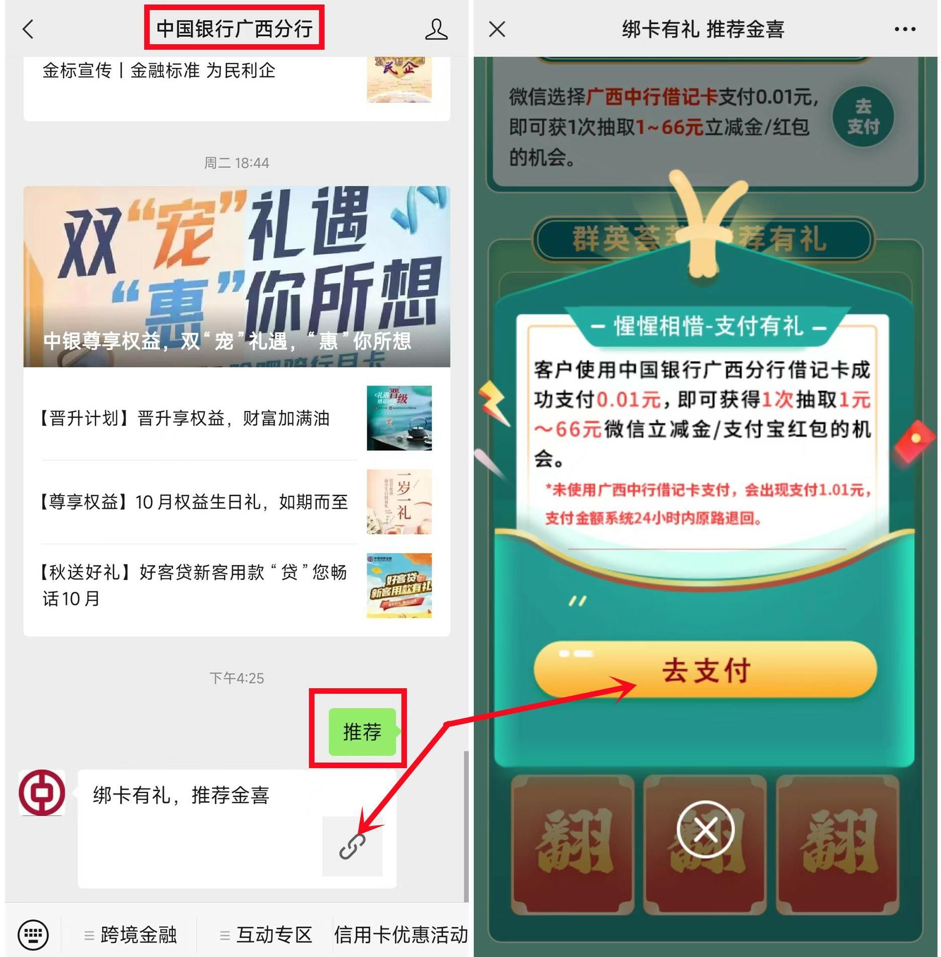 关注“中国银行广西分行”公众号回复“推荐”参与抽奖,最高可领66元微信立减金。立减金可用于微信话费充值等活动