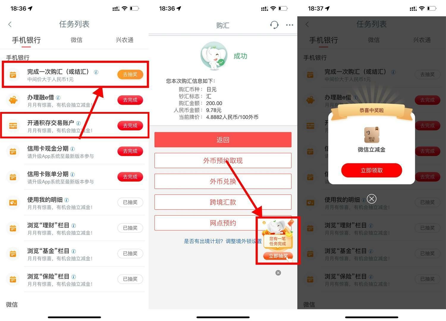 2、、右下角抽立减金->抽完之后搜索“结售汇”->再把曰元卖掉即可(实际损失0.06元左右)