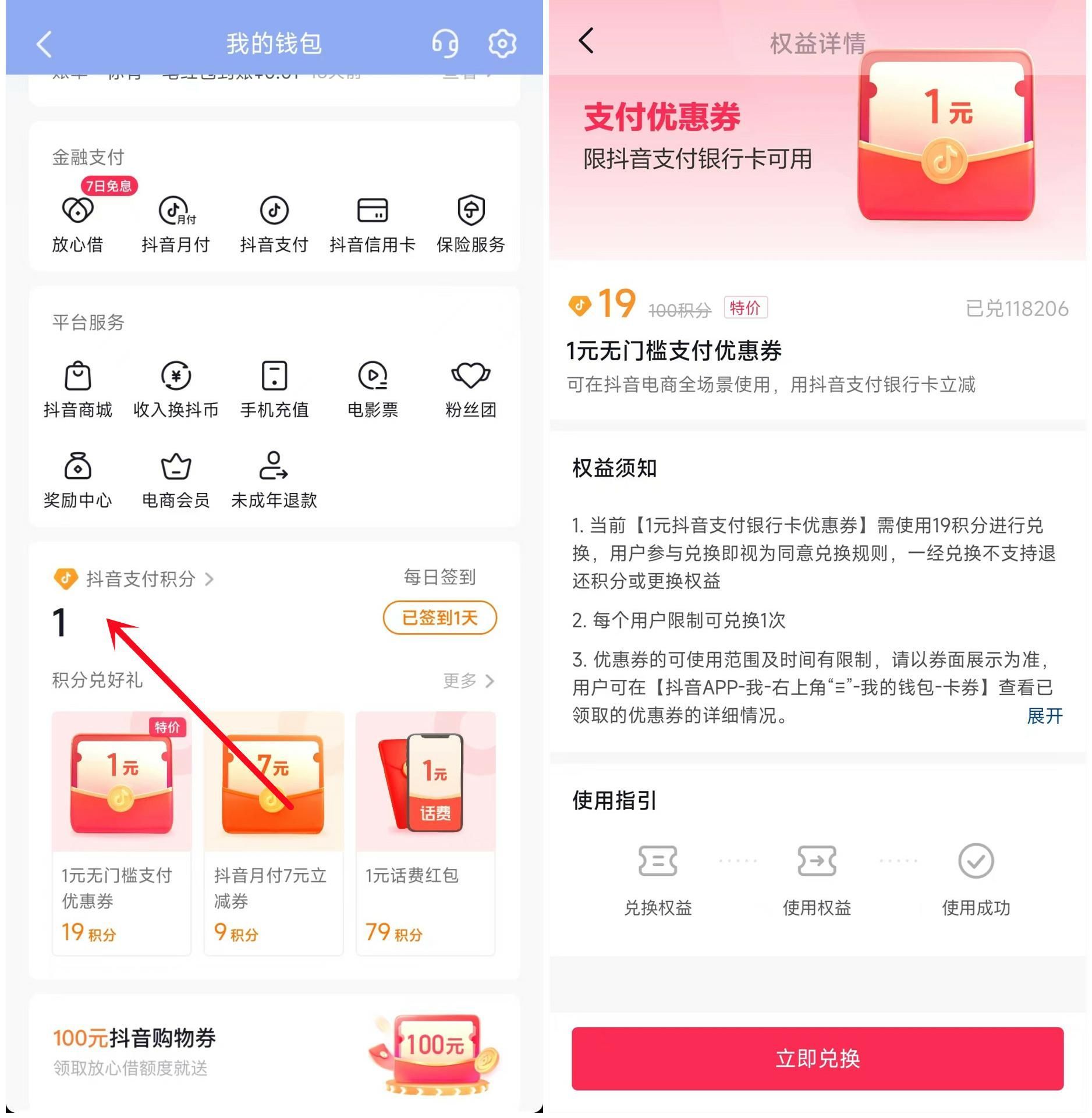 抖音积分兑1元无门槛支付红包/实物 长期活动