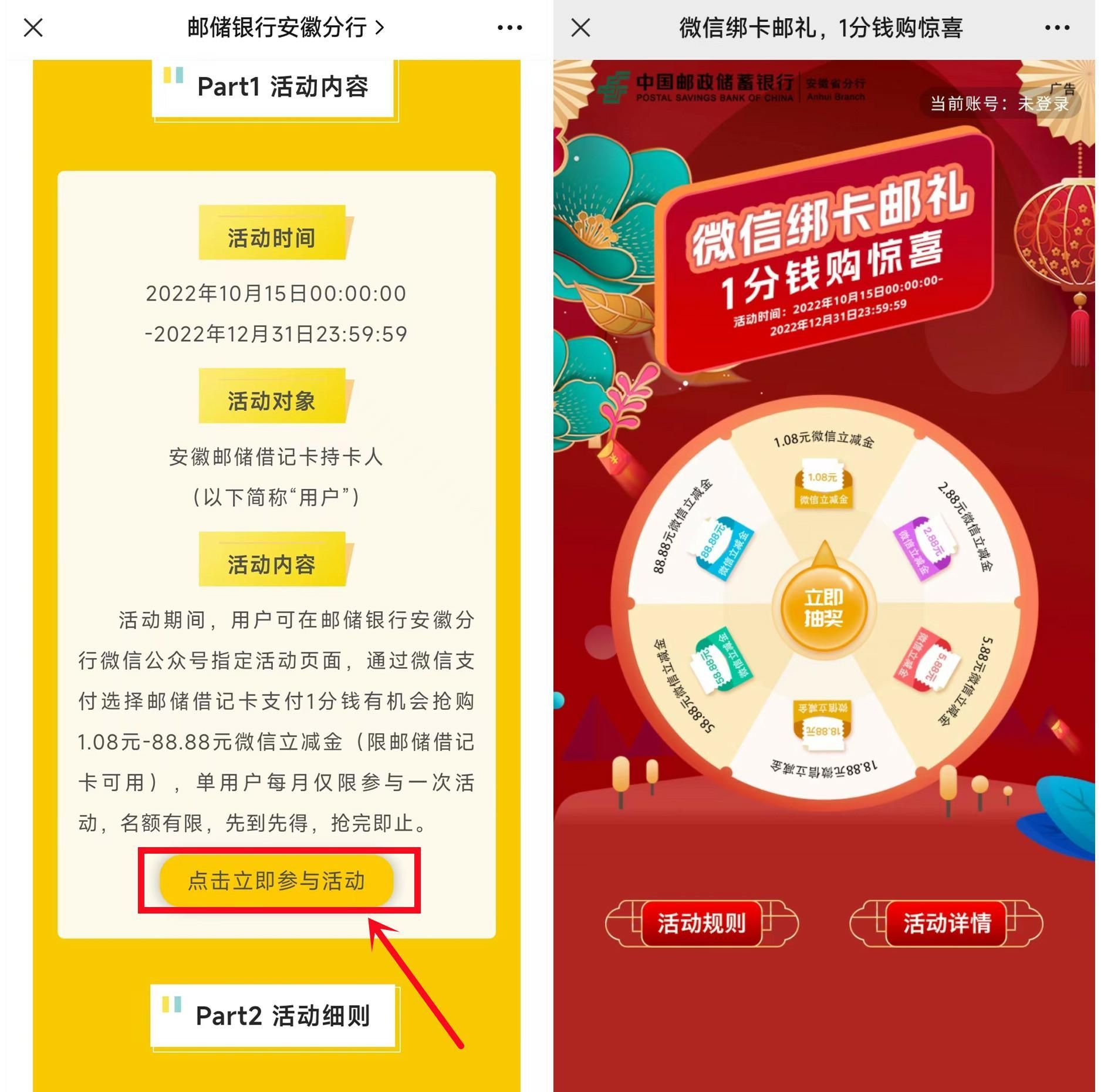 参与活动前,需先在微信绑定安徽邮储银行借记卡,并使用安徽邮储银行借记卡支付1分钱后可参与抽奖活动,若银行卡不符合活动参与条件,客户支付金额将会退回,无法享受优惠。