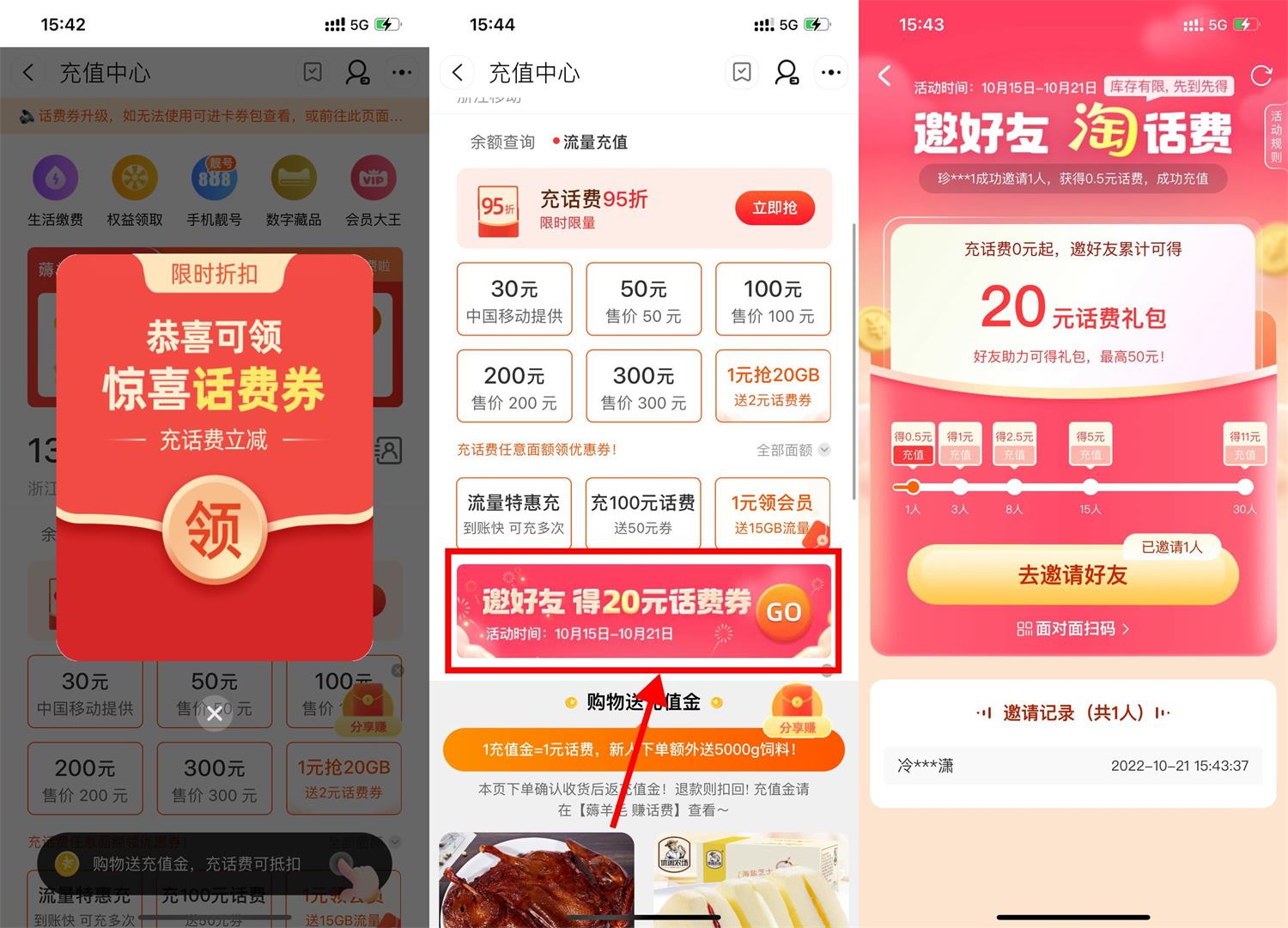 淘宝APP首页“充值中心”->自动弹出0.5元惊喜话费券->下拉点邀请1个好友再得0.5元话费券,直接充2次1元话费