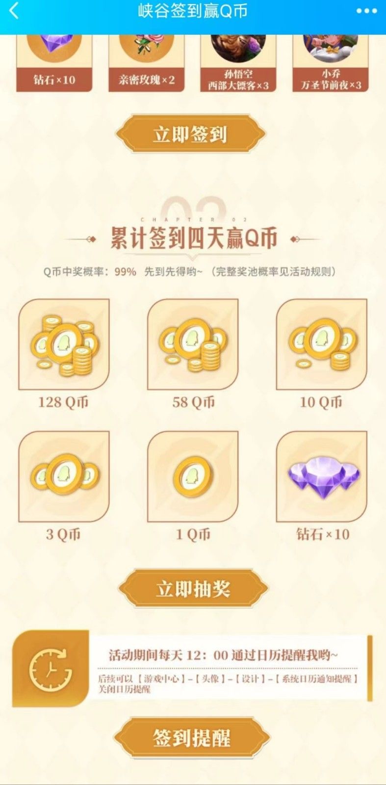 王者荣耀峡谷签到4天抽1-128QB,有兴趣的可以去参与下。
