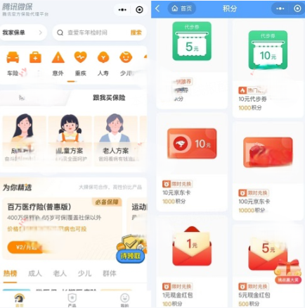 微信小程序,腾讯微保,有个添加保险到购物车的任务,完成后,可以免费领取100积分,刚好可兑换1元现金红包,新老用户均可参与,不过红包每天限量,先把积分领了,每天上午10点开始兑换红包吧!
