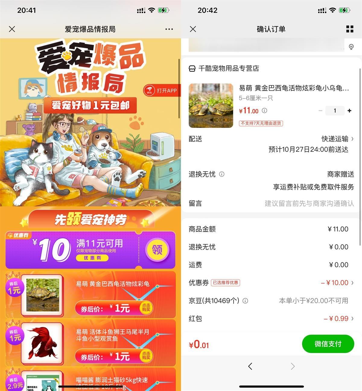 京东APP搜索“分20亿”->右侧“限时福利”领1元购物红包->微信打开地址->领取11减10元券->抵扣红包后0.01元到手