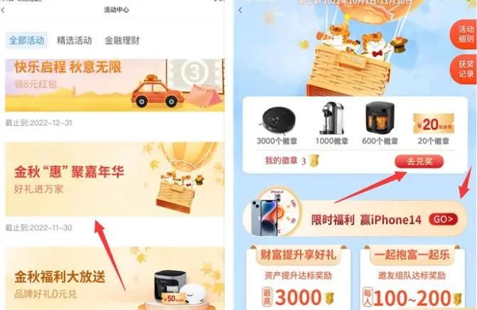 交通银行app活动中心,金秋惠聚嘉年华-限时福利,简单浏览一下,返回抽徽章,徽章兑换贴金券,次数刷新了,只要不是抽到的1都能兑换5块——