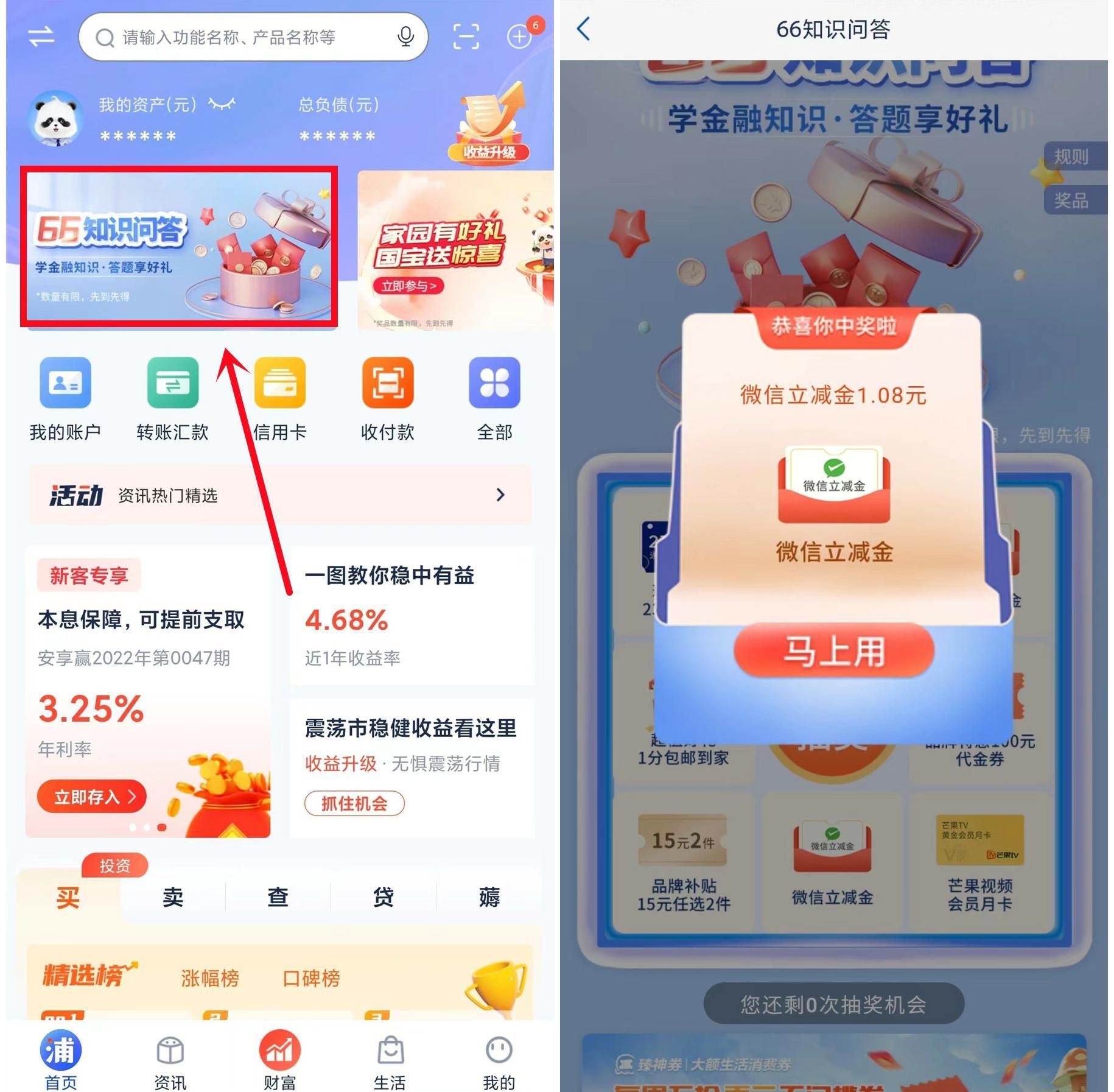 1、打开浦发银行APP,在首页点顶部滚动图【66知识问答】进去活动里