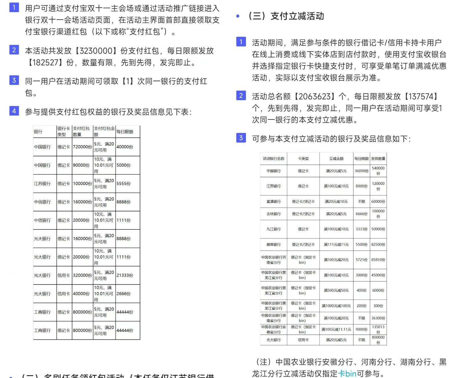 以下是支付红包和支付立减活动银行卡和奖品如下: