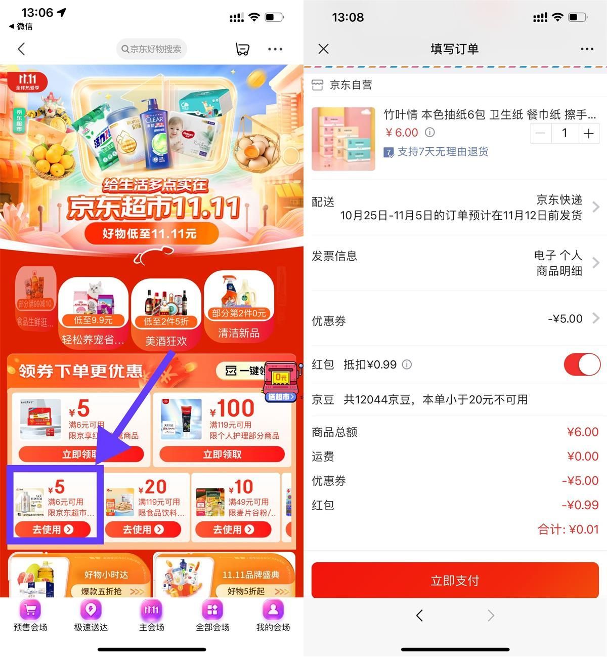 在“微信-发现-购物”进入领个签到红包,再打开领券地址右划领6减5元券,最后任选一个商品抵扣红包下单即可