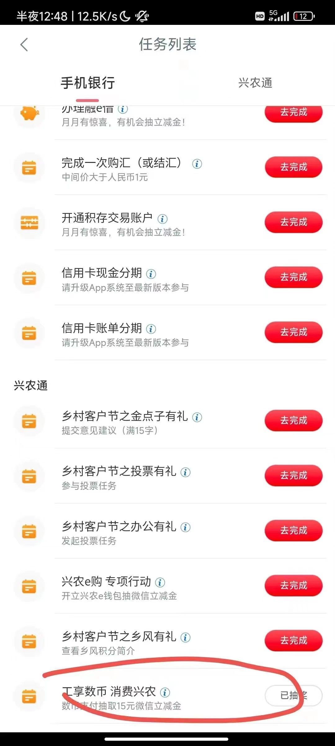 工商银行,我的,任务中心,下滑找到这个任务,跳转兴农通,往隶属于工商的数币钱包冲0.01扫上面的二维码,支付0.01,右下会弹抽奖,15立减金——