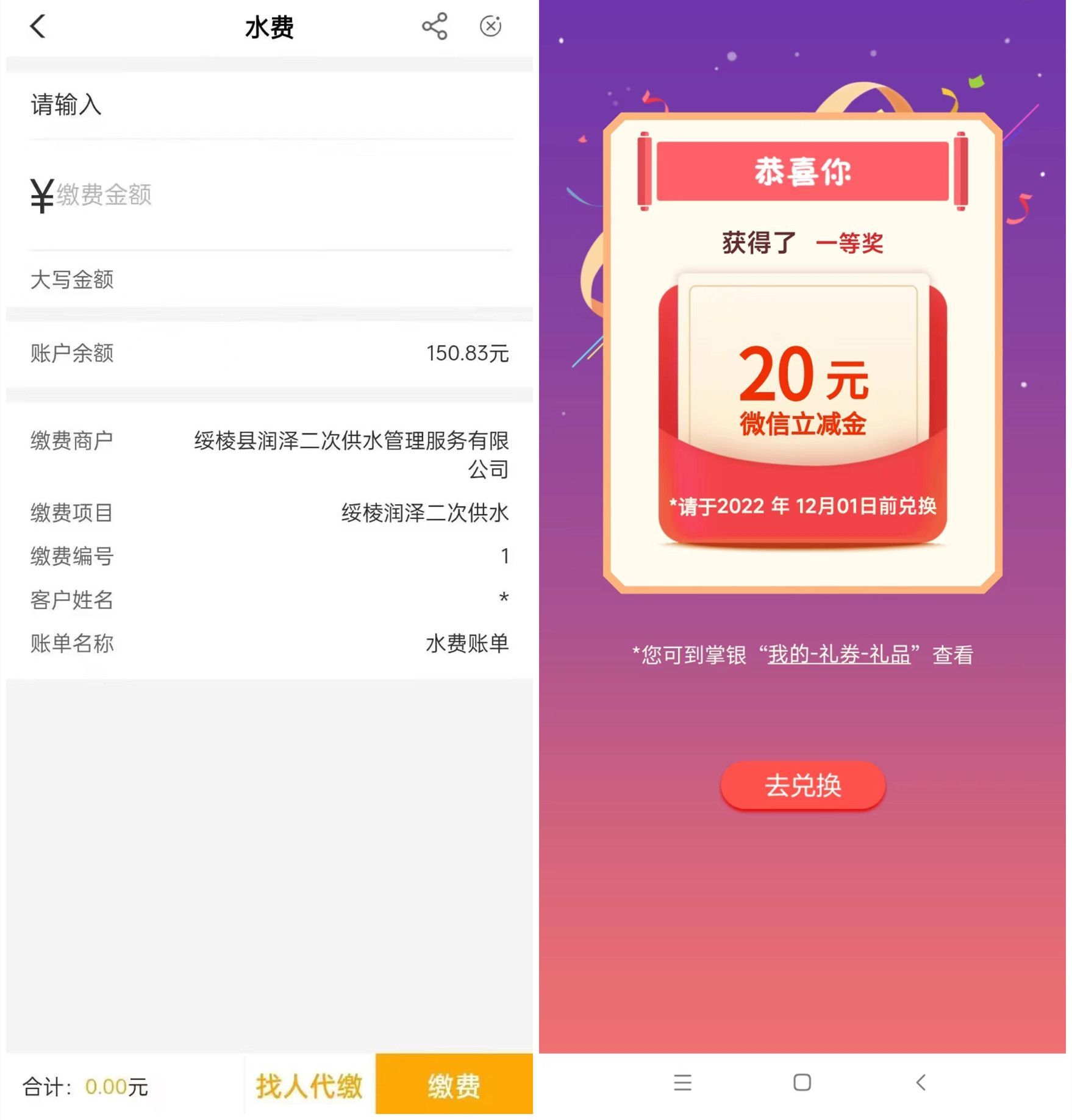 黑龙江农行掌银缴费抽30元微信立减金(有水)