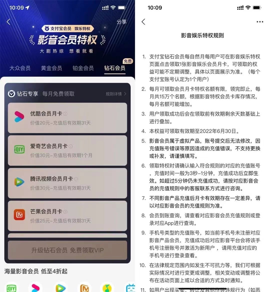 打开支付宝APP我的--支付宝会员--更多特权--往下拉可以看到【影音会员】进入领取。