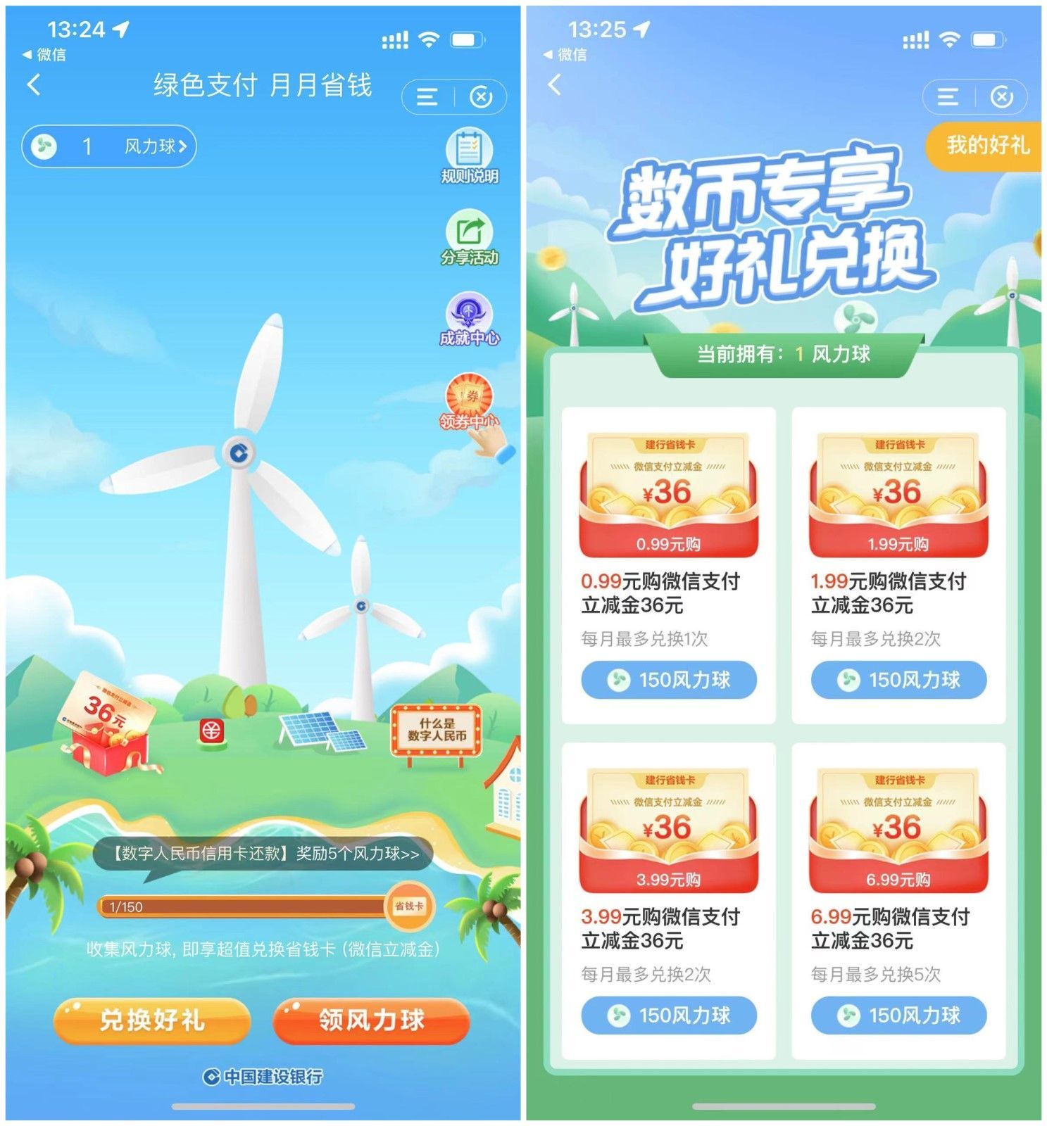 建行绿色支付达人做任务0.99元购买36元微信立减金 可多次兑换
