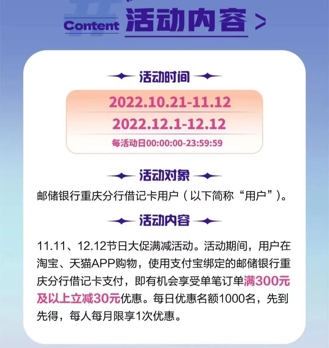 邮储重庆(含电子卡)淘宝天猫闲鱼消费满300减30