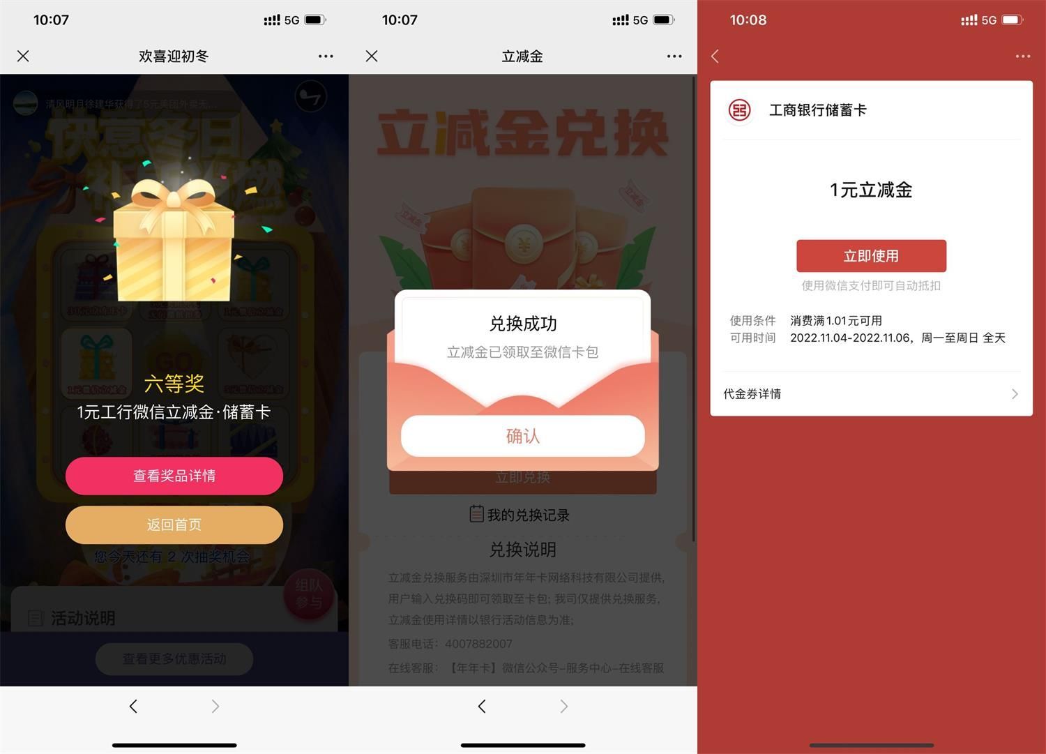 微信关注公众号“年年卡”->打开地址进入活动->默认有3次机会,组队额外得3次机会->抽中立减金复制兑换码兑换