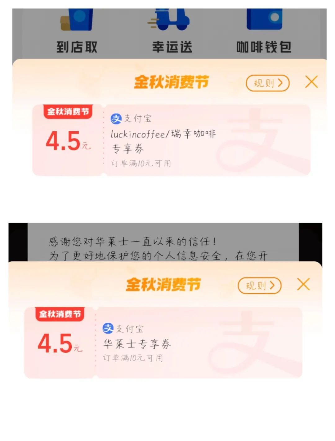 金秋消费券又有了,支付宝分别搜索“华莱士自助点餐”、“瑞幸咖啡”,点击金秋消费券进入领取,是专享券,大品牌商家都可以搜一下