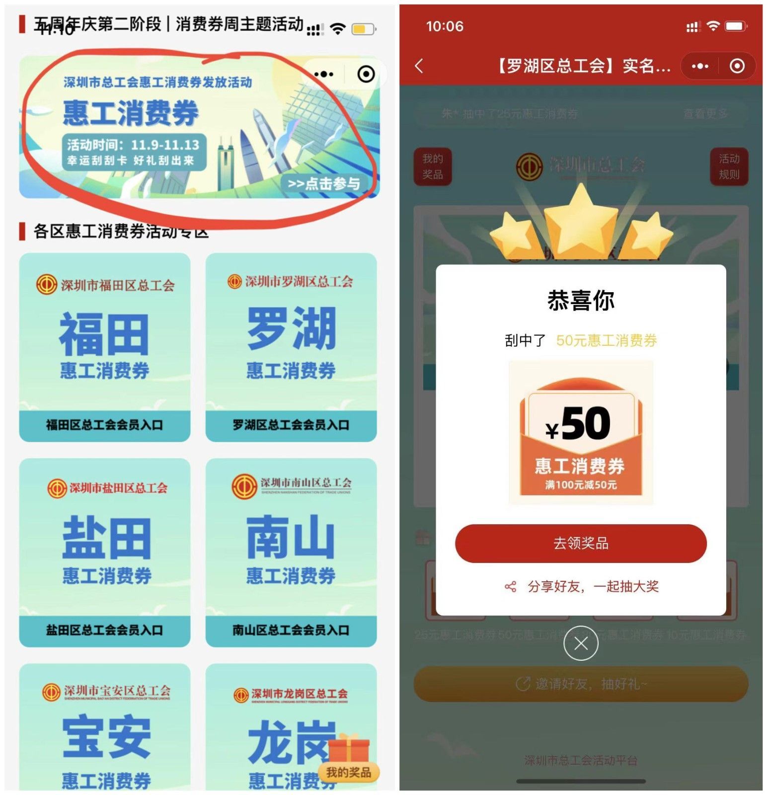 1、微信扫码或微信小程序搜索【深工惠】进入——非必中,一个人抽两次,五周年庆第二阶段,另外一次就看你们之前加入的是哪个工会会员进去抽,如果是10月19号之后入会的还能多抽一次。
