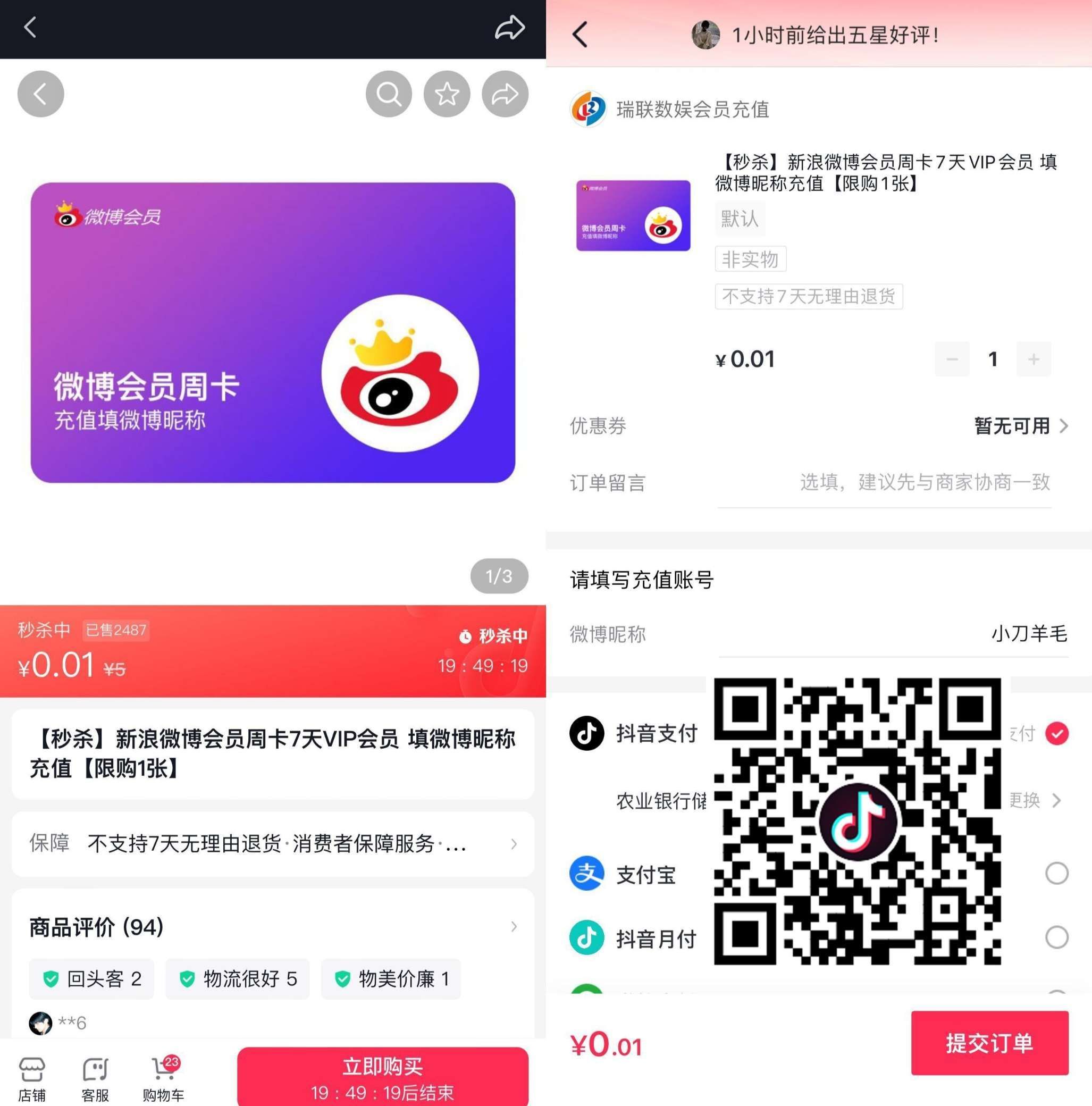 【抖音0.01元薅7天微博会员】抖音APP扫码->填写微博昵称->直接下单秒到 !