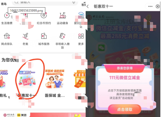 中行app生活改定位青岛,钜惠双十一点进去抽,一个手机号抽一次,