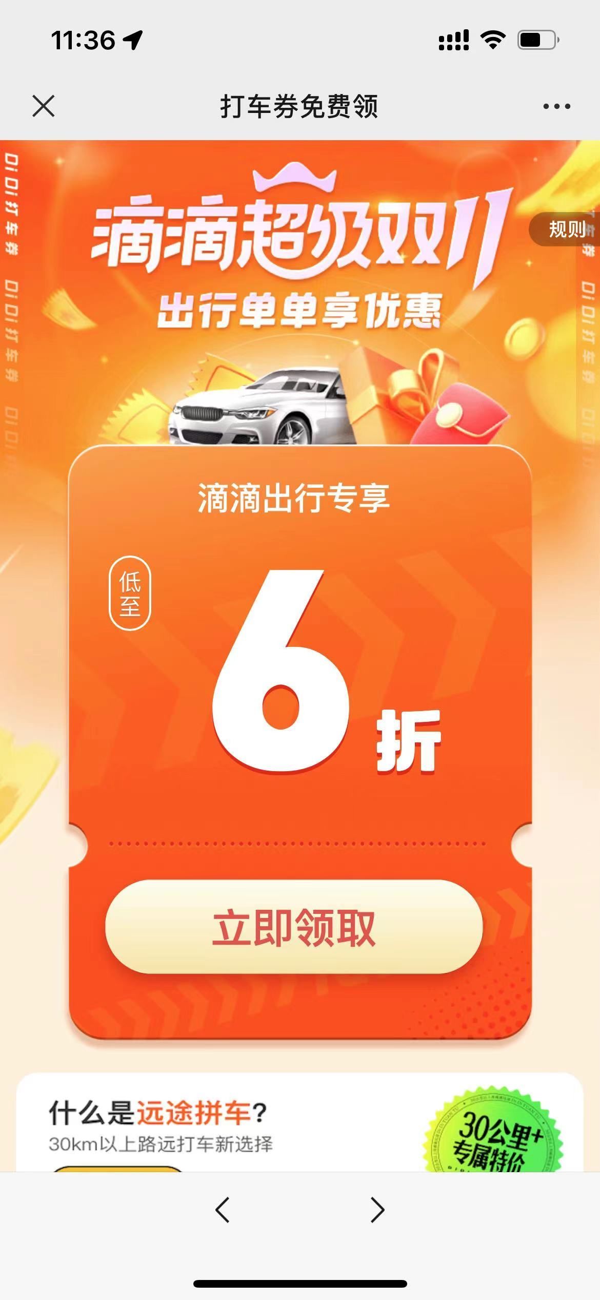 本文进入活动可以免费领取滴滴出行6折快车券,有效期3天时间