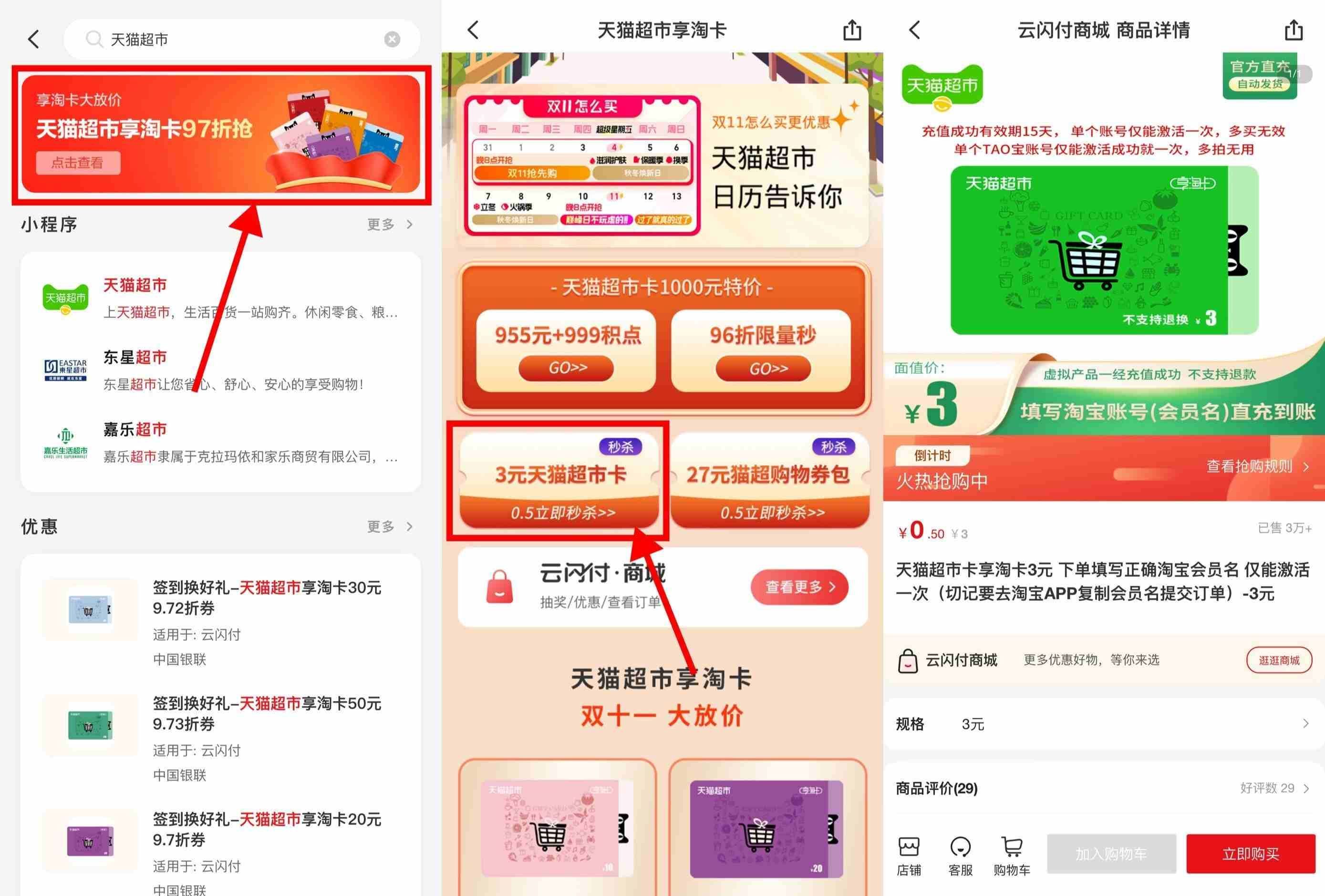 云闪付APP搜索“天猫超市”->点击横幅进入->点击3元猫超卡进入->直接填写昵称购买即可!