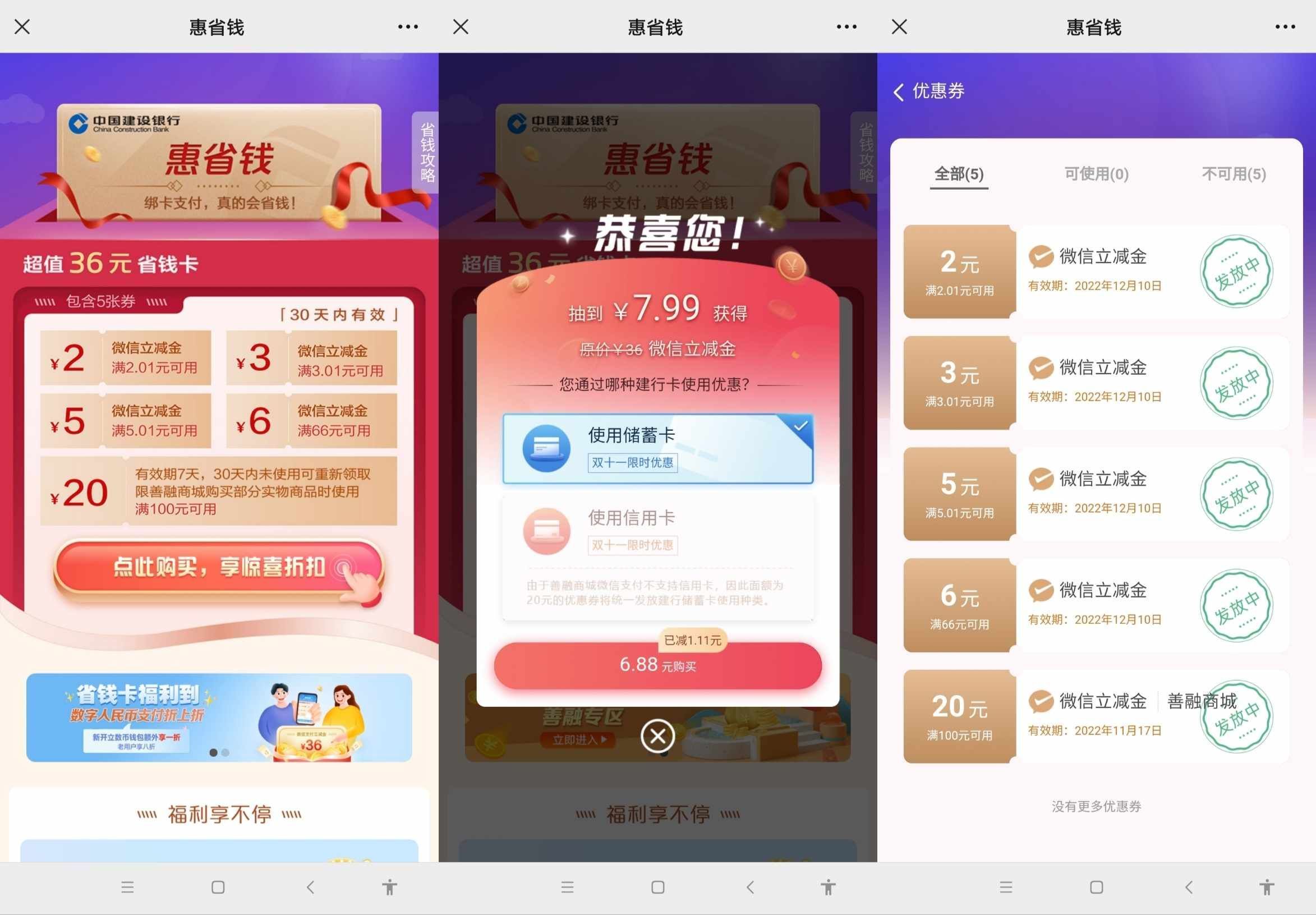新一期,建行6.88元购买16元微信立减金+20元善融券,每个月都可以参加1次,今天还会额外立减1.11元