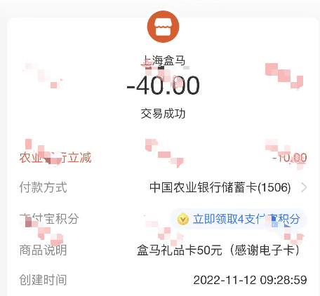 湖南农行实体卡/电子卡的可以购买50元盒马礼品卡立减10元,每天早上8点开始,名额有限,活动截止12月31日,每人每个月可以享受一次优惠,盒马App在首页左上角修改【西安市】搜索【电子礼品】购买50元电子卡,使用湖南农行支付立减10元
