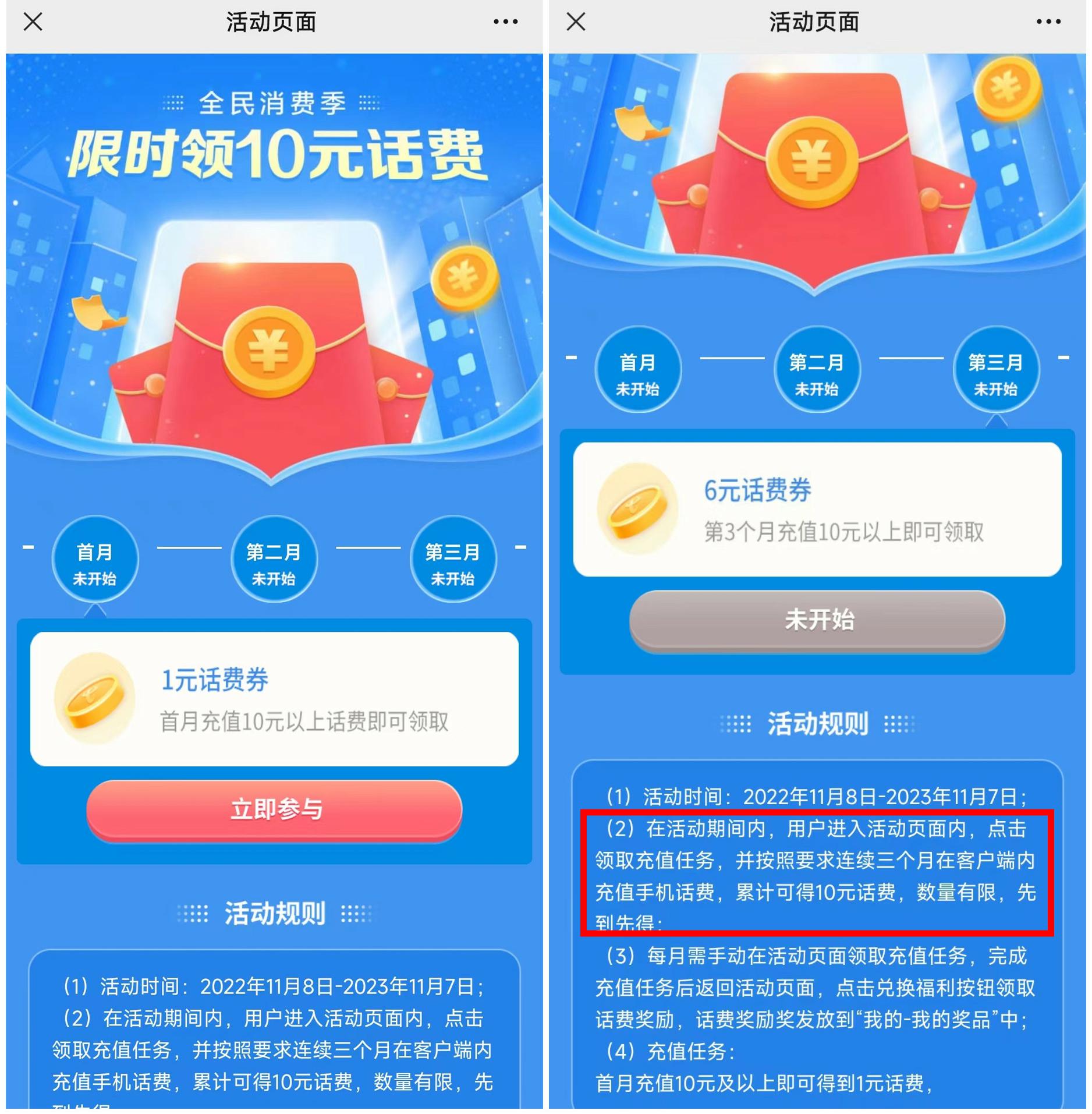 第二个月充值10元获得3元话费券,第三个月充值10元获得6元话费券