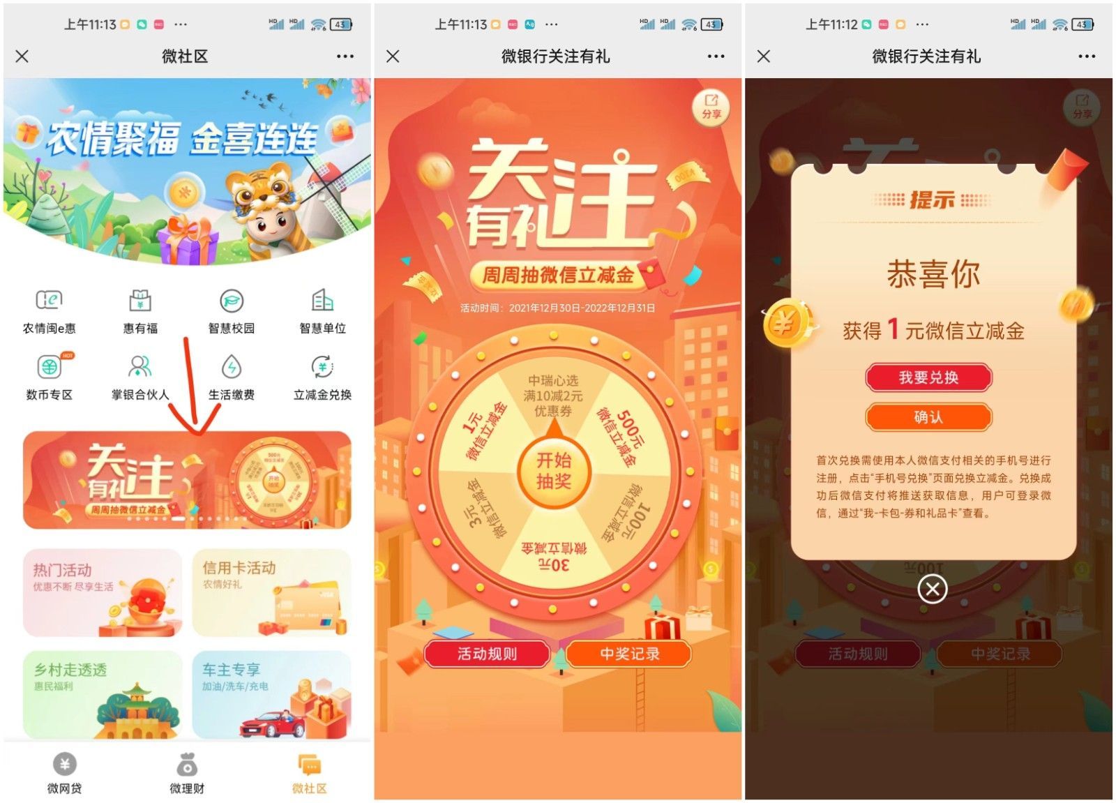 可以抽1-500元微信立减金,微信号多的可以多撸,微信关注【福建农行微银行】公众号,进入【微社区】中间滚动入口【关注有礼】进入,全国农行卡都可以使用