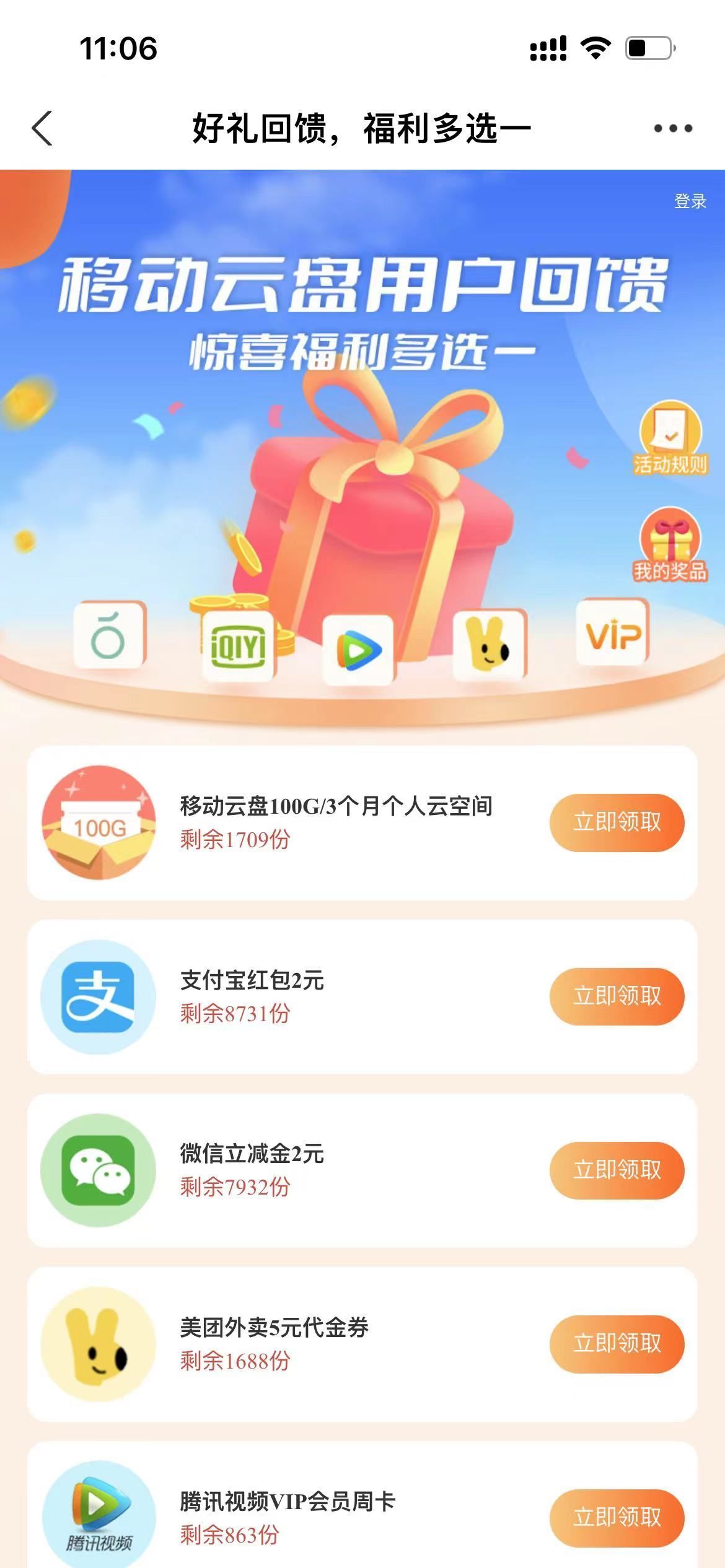 移动云盘领2元支付宝红包、2元微信立减金、或视频会员周卡